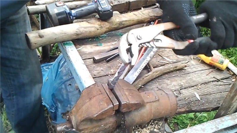 - Быстро извлеките сверло из горна и закрепите в тисках.