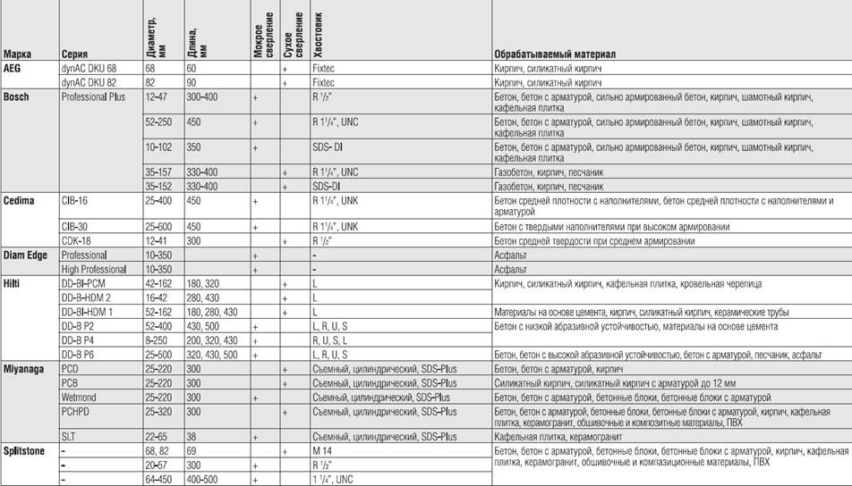 Как мы уже говорили, на рынке вы найдете широкий ассортимент алмазных коронок от различных производителей. Размещенная ниже таблица с характеристиками самых популярных моделей поможет вам выбрать наиболее подходящий инструмент.