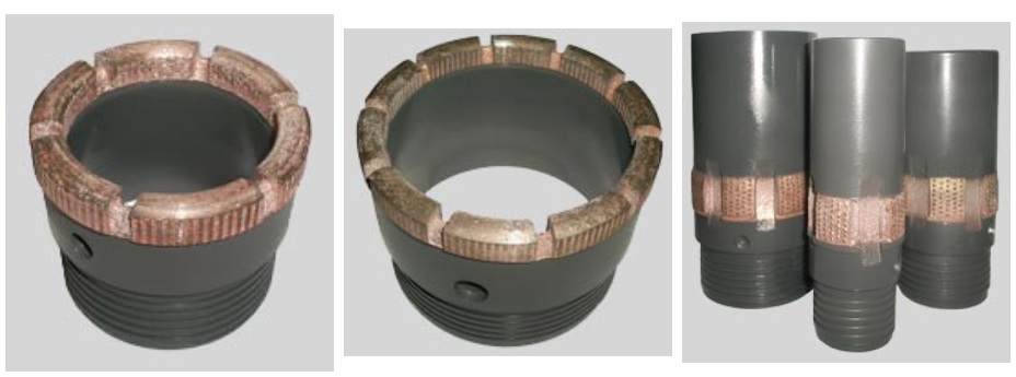 Состоят из полых цилиндрических корпусов, хвостовиков и покрытых алмазной крошкой матриц. Также применяются для безударного сверления.