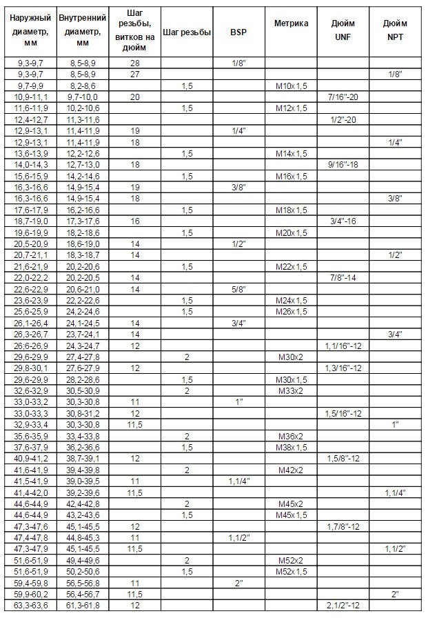 Таблица 1. Шаг и диаметр для дюймовой и метрической резьбы