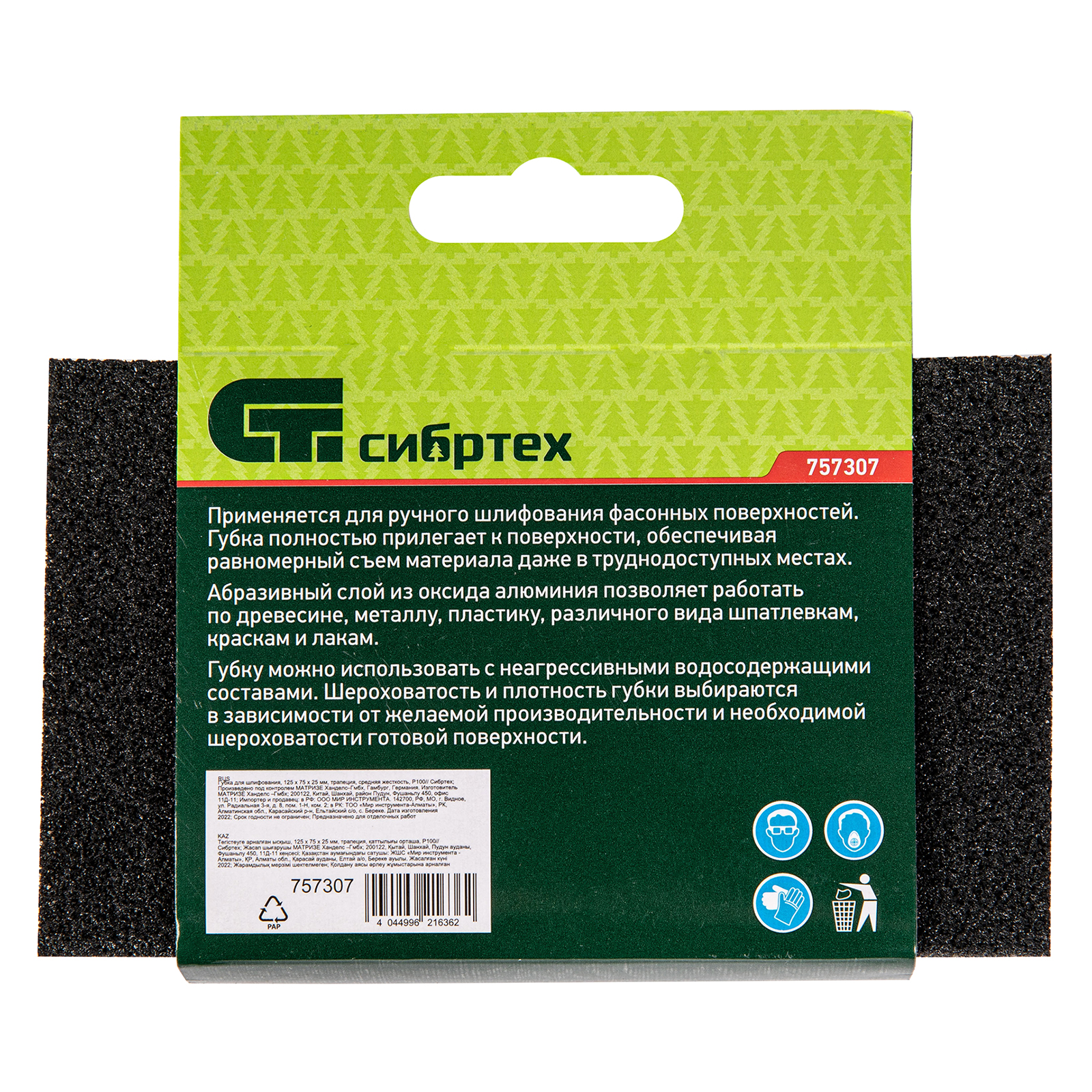 Средней жесткости губка для шлифования Сибртех 757307 P 100, 125 x 75 x 25 мм, трапеция, используется для ручной обработки дерева, пластика, металла. Благодаря размерам зерна 400-500 мкм она эффективно удаляет краску, ржавчину, грубые неровности. Применяется при отделочных работах, кузовном ремонте, изготовлении мебели.ПреимуществаБлагодаря скошенному краю губки ею можно обрабатывать узкие места, углы, пазы и труднодоступные поверхности.Среднезернистый абразив P 100 из твердого оксида алюминия позволяет с высокой эффективностью проводить грубую (черновую) шлифовку даже при большом объеме работ.Мягкая поролоновая основа позволяет шлифовать рельефные поверхности.Губка водостойкая, поэтому ее можно использовать для мокрой шлифовки и промывать для повторного применения.Абразивный слой нанесен на губку с 4-х сторон, поэтому она прослужит долгое время.