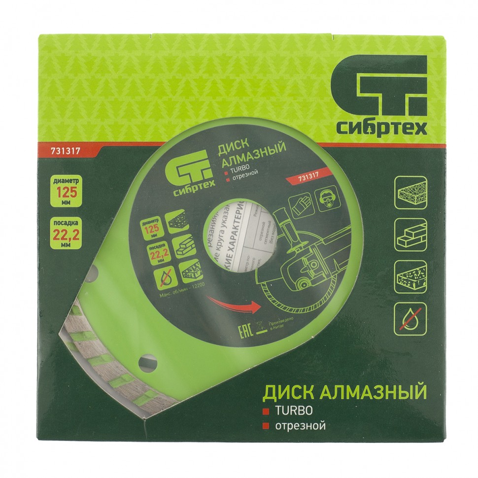 Диск отрезной алмазный 125х22,2 мм, сухая резка, Turbo Сибртех, арт: 731317