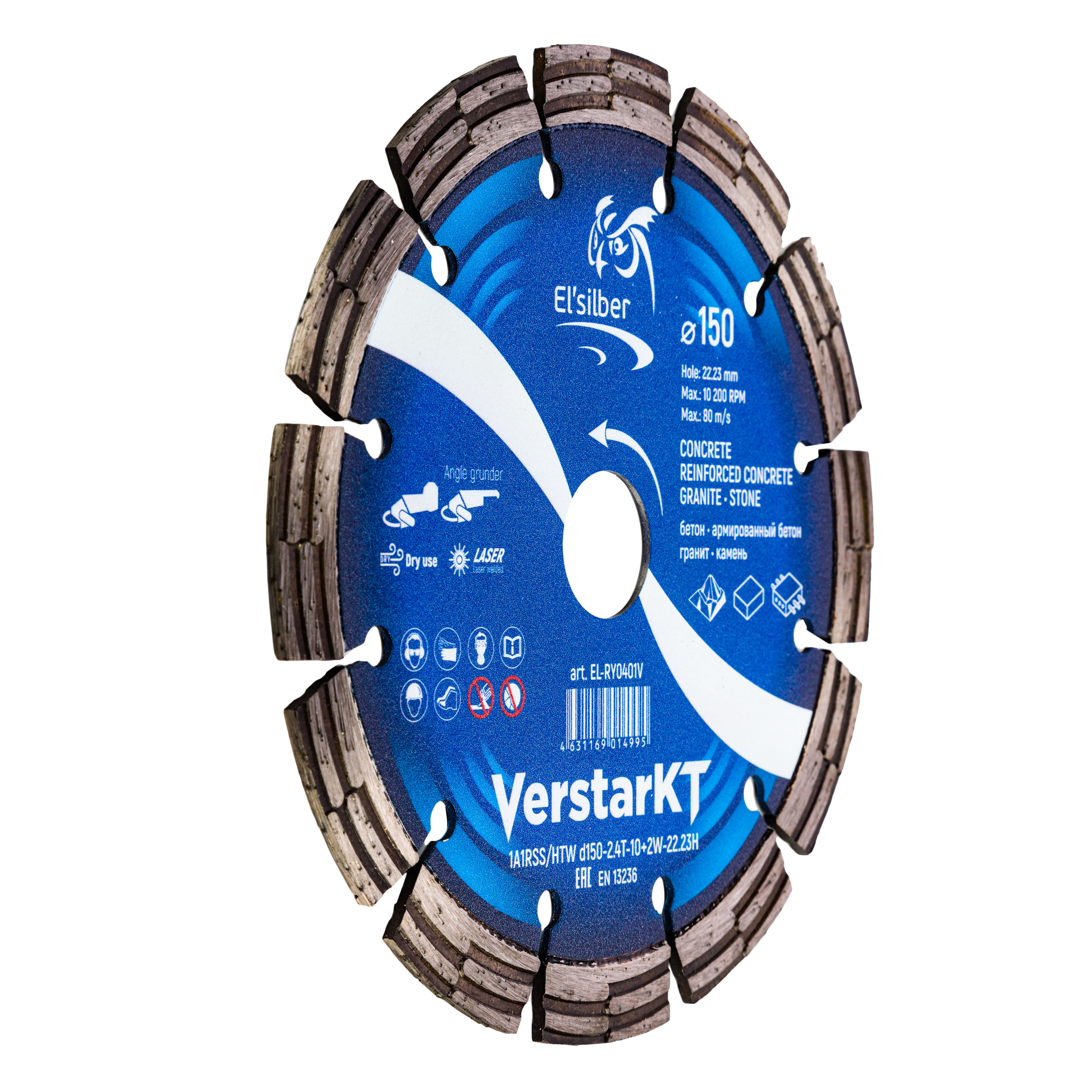Круг алмазный 1A1RSS/HTW "VerstarKT" Elsilber - специальная разработка для решения строительных задач широкого спектра. Продвинутая форма сегментов обеспечивает дополнительное эффективное охлаждение при полном погружении режущей части в материал. Диск универсален для работы с твердыми материалами, используется в работе с бетоном, армированным и высокоармированным бетоном. Применим для работ по штроблению под электропроводку и водопровод.