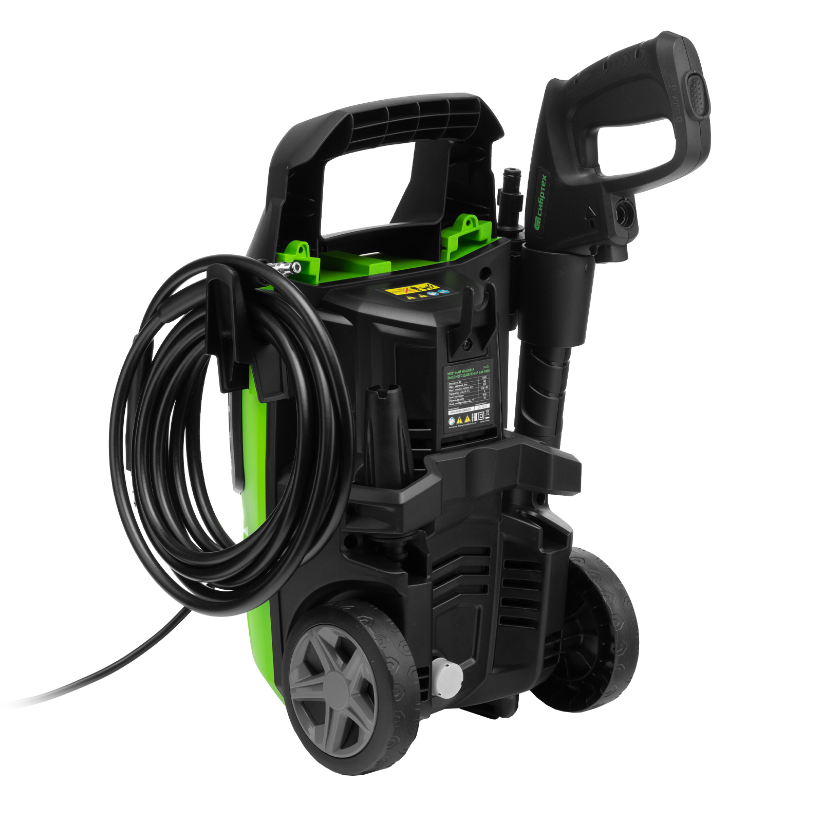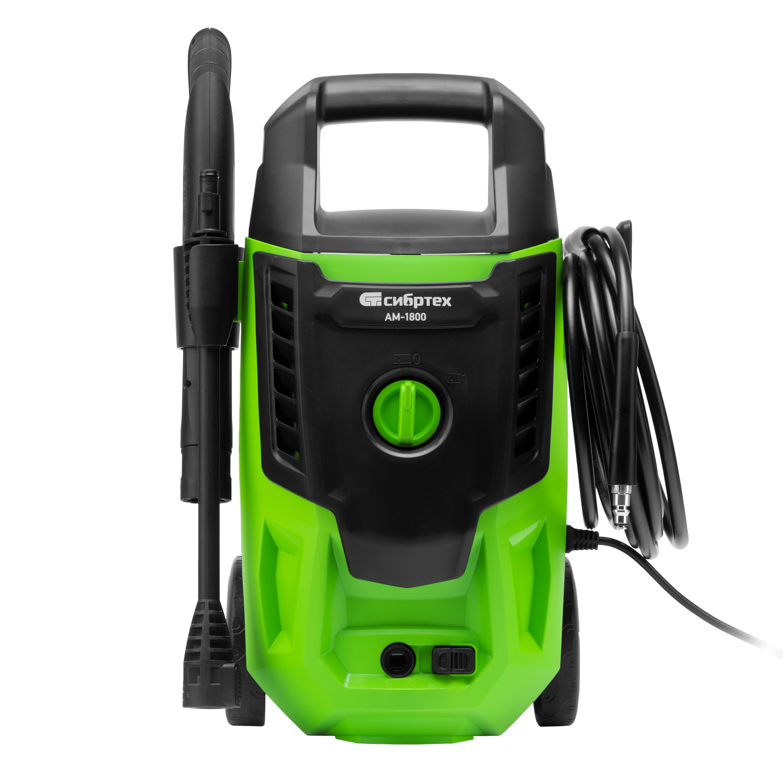 Колесная моечная машина высокого давления Сибртех AM-1800 58226 мощностью 1800 Вт и производительностью 350 л/ч подает струю воды 140 бар. Позволяет быстро очистить садовые дорожки, забор, стены строений, садовый инвентарь, уличную мебель, кузов автомобиля. Машина подключается к водопроводу, а также способна работать в режиме самовсасывания — в этом случае в качестве источника воды можно использовать любую емкость. Устройство будет полезно владельцам дачных участков.ПреимуществаВысокий ресурс — алюминиевая помпа выдерживает интенсивное использование.Экологичность — во время работы машины отсутствуют вредные выхлопы и неприятный запах.Термозащита — в случае перегрева двигатель отключается для предотвращения поломки.Электробезопасность — токопроводящие элементы имеют двойную изоляцию.Удобная регулировка струи — вращая корпус сопла, можно установить оптимальный вид распыления.Эффективное очищение — в комплект поставки входит внешний пеногенератор, позволяющий использовать моющие средства.Удобная работа в труднодоступных местах — на пистолет можно установить насадку-удлинитель.Безопасность — блокировка рычага пистолета предотвращает случайный запуск.Защита от засоров — входной штуцер имеет встроенный фильтр, задерживающий посторонние частицы.Легкая подготовка к работе — быстросъемный адаптер позволяет подключить входной шланг одним движением.Свободное передвижение по рабочей зоне — длина сетевого кабеля и шланга составляет 5 м, что позволяет реже перемещать мойку во время работы.Простое обслуживание — в комплект поставки входит игла для прочистки сопла.Продуманное хранение и транспортировка — машина снабжена удобной ручкой и колесами, для кабеля и шланга предусмотрены специальные кронштейны.