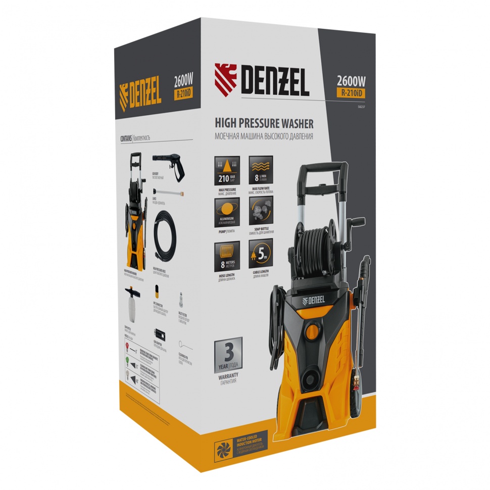 Моечная машина высокого давления Denzel R-210iD 58237 производительностью 8,0 л/мин, с асинхронным двигателем и барабаном для шланга, потребляет 2600 Вт и подает воду под давлением 210 бар. Обеспечивает эффективное очищение автомобилей, заборов, дорожек и садового инвентаря. Благодаря функции самовсасывания мойка может забирать воду из любых емкостей, теряя при этом не более 5% давления, поэтому ее можно использовать при отсутствии доступа к водопроводу.ПреимуществаРабота в труднодоступных местах — быстросъемные форсунки (входят в комплект) позволяют подобрать оптимальный режим, а насадка-удлинитель — мыть рельефные поверхности.Внешний пенокомплект — можно наносить на поверхности моющий раствор для более эффективного очищения.Защита от случайного пуска — производителем предусмотрена блокировка рычага пистолета.Термозащита — автоматическое отключение при перегреве предотвращает поломку двигателя.Надежная конструкция — металлические штуцеры выдерживают даже сильные рывки шланга.Быстрое подключение — HPC-коннектор позволяет легко подсоединять шланг к патрубку мойки.Подготовка к работе за несколько секунд — благодаря быстросъемному коннектору пистолет подключается к шлангу одним движением.Чистая вода — надежный фильтр защищает от засоров и продлевает срок службы помпы.Степень защиты IPX5 — исключено прямое попадание внутрь корпуса воды под любым углом при давлении не более 30 кПа.Электробезопасность — токопроводящие элементы изолированы, предусмотрено заземление (класс защиты I).Мобильность — колеса и телескопическая ручка позволяют легко перемещать мойку во время использования.Комфортная работа — оптимальная длина сетевого кабеля 5 м и увеличенная длина шланга 8 м позволяют свободно перемещаться по рабочей зоне, а чтобы шланг не запутался, его можно быстро намотать на катушку с ручкой.Удобное хранение — мойка оснащена складной ручкой, держателем пистолета и кронштейном под кабель.Гарантия 3 года — качество инструмента подтверждено производителем.