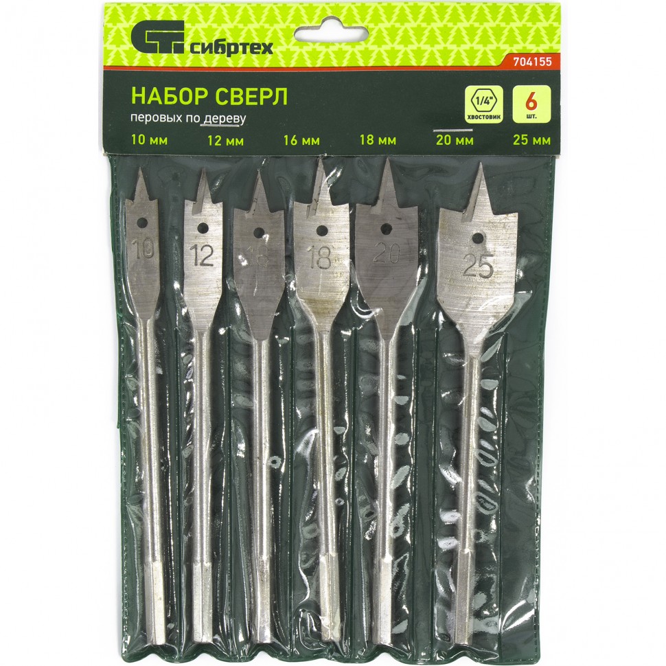 Перовые сверла изготовлены из углеродистой стали. Твердость режущих кромок 45–54 HRC. Предназначены для сверления отверстий в древесине. Комплектация: 10-12-14-16-18-20-25 мм. Хвостовики имеют шестигранную форму, что предотвращает поворот сверла. Центрирующее острие исключает необходимость в предварительном засверливании.