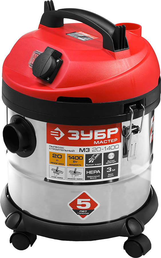 Строительный пылесос ЗУБР ПУ-20-1400 М3, предназначен для уборки помещений, а также для принудительного удаления продуктов пиления, строгания, фрезерования и многих других частиц из рабочей зоны электроинструмента. Имеется мощный двигатель, который обеспечивает большую силу всасывания. Возможность влажной уборки и сбора жидкости делают изделие универсальным с широким спектром применения. Нержавеющий корпус бака гарантирует долговечность. Фильтр HEPA для максимальной чистоты уборки и защиты двигателя от пыли. Встроенная розетка обеспечивает возможность синхронной работы с инструментом. Максимальная мощность подключаемого инструмента - 2000 Вт.