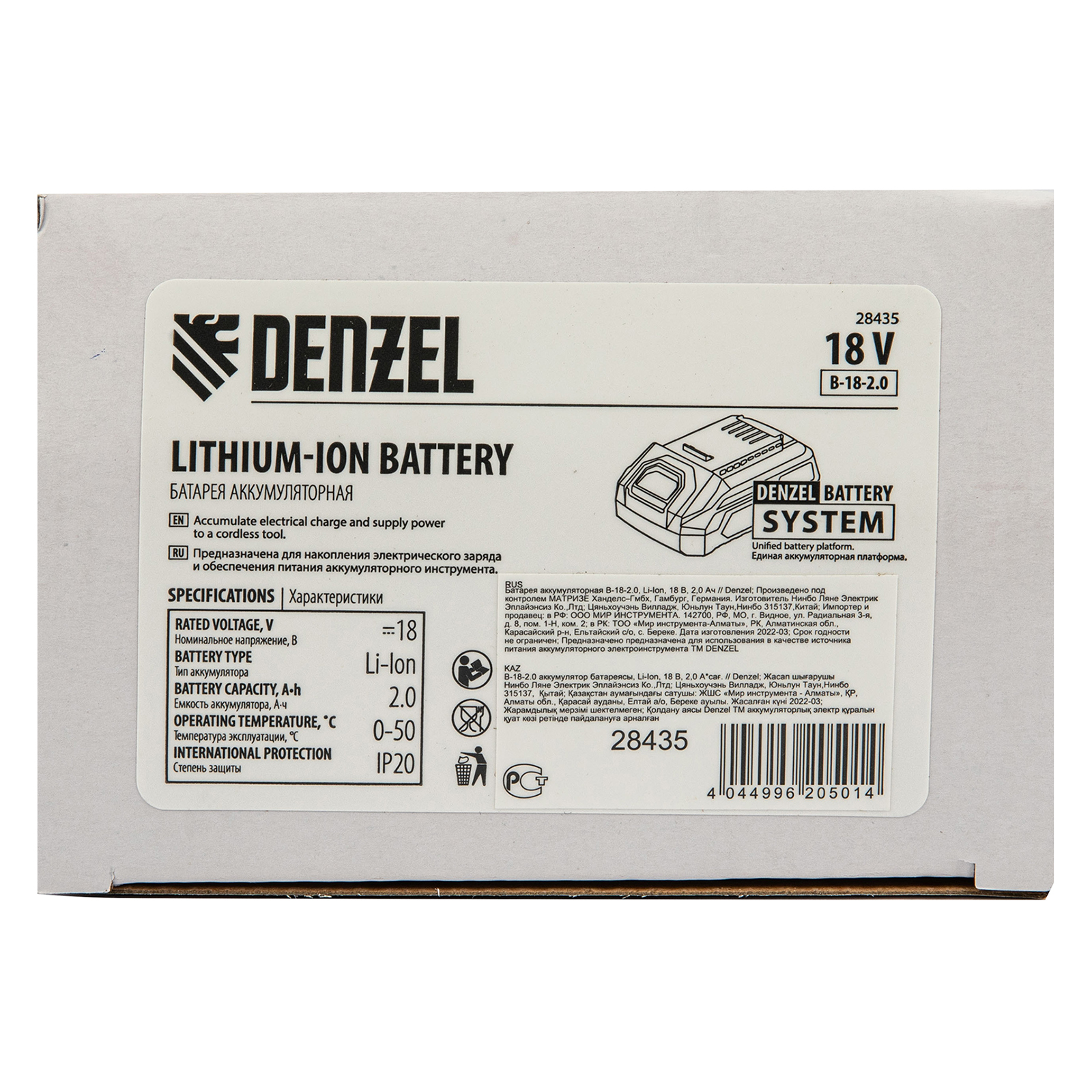 Батарея Li-Ion Denzel B-18-2.0 28435 на 2,0 Ач, номинальным напряжением 18 В, предназначена для обеспечения бесперебойной работы аккумуляторного инструмента. Совместима со всеми инструментами 18V Denzel battery system серии IB и соответствующими зарядными устройствами. Благодаря отсутствию эффекта памяти аккумулятор сохраняет максимальную эффективность на протяжении всего срока службы.ПреимуществаЗащита от перегрузок — аккумулятор отключается при превышении допустимых значений силы тока, что предотвращает его поломку.Термозащита — при возникновении угрозы перегрева батарея отключается до полного остывания.Защита от глубокого разряда и перезаряда — автоматический контроллер своевременно отключает нагрузку, исключая выход аккумулятора из строя.Контроль оставшегося времени работы — батарея оснащена LED-индикатором уровня заряда.