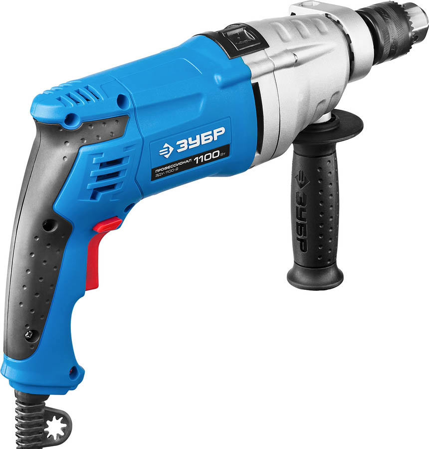 Дрель ударная электрическая ЗУБР ЗДУ-1100-2 ЭРММ2, предназначена для сверления отверстий в различных материалах (дерево, сталь и т. д.). Профессионального уровня дрель с металлическим корпусом, двухскоростным редуктором, качественным кулачковым патроном, плавной регулировкой оборотов и надежной конструкцией на подшипниках - лучший подарок мастеру. Функция сверления с ударом, широкий диапазон регулировки частоты вращения, удобная дополнительная рукоятка - все, что нужно для качественной работы. Надежный инструмент для эффективной, качественной работы. Профессиональная дрель для самых сложных работ. Корпус редуктора из литого под давлением алюминия обладает повышенной прочностью, обеспечивает лучший теплоотвод и увеличивает надежность вследствие стабильности геометрических размеров. Благодаря двухскоростному редуктору с широким диапазоном скоростей изделие может выполнять большой спектр задач: сверление, заворачивание, перемешивание, шлифование и т.д.