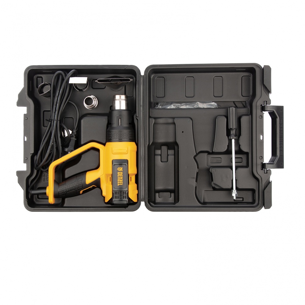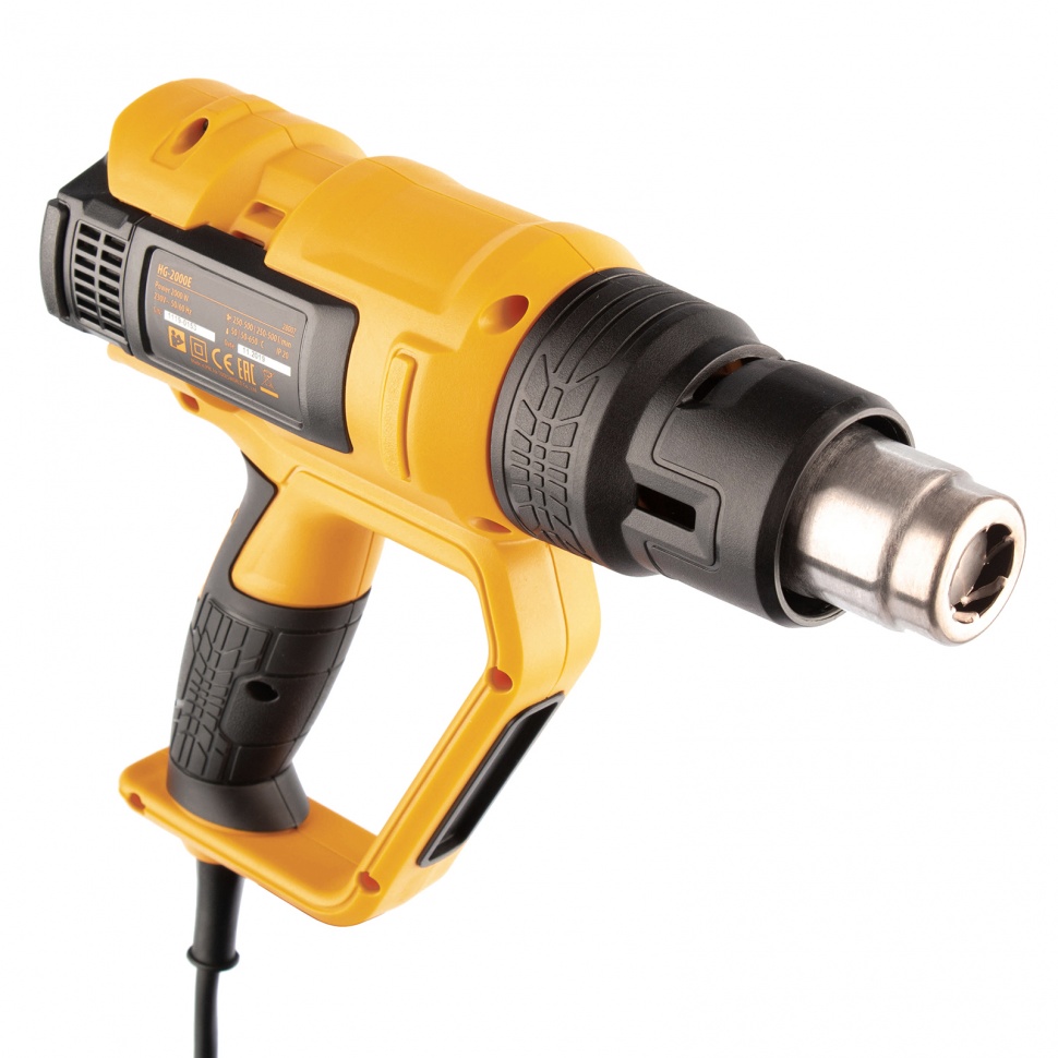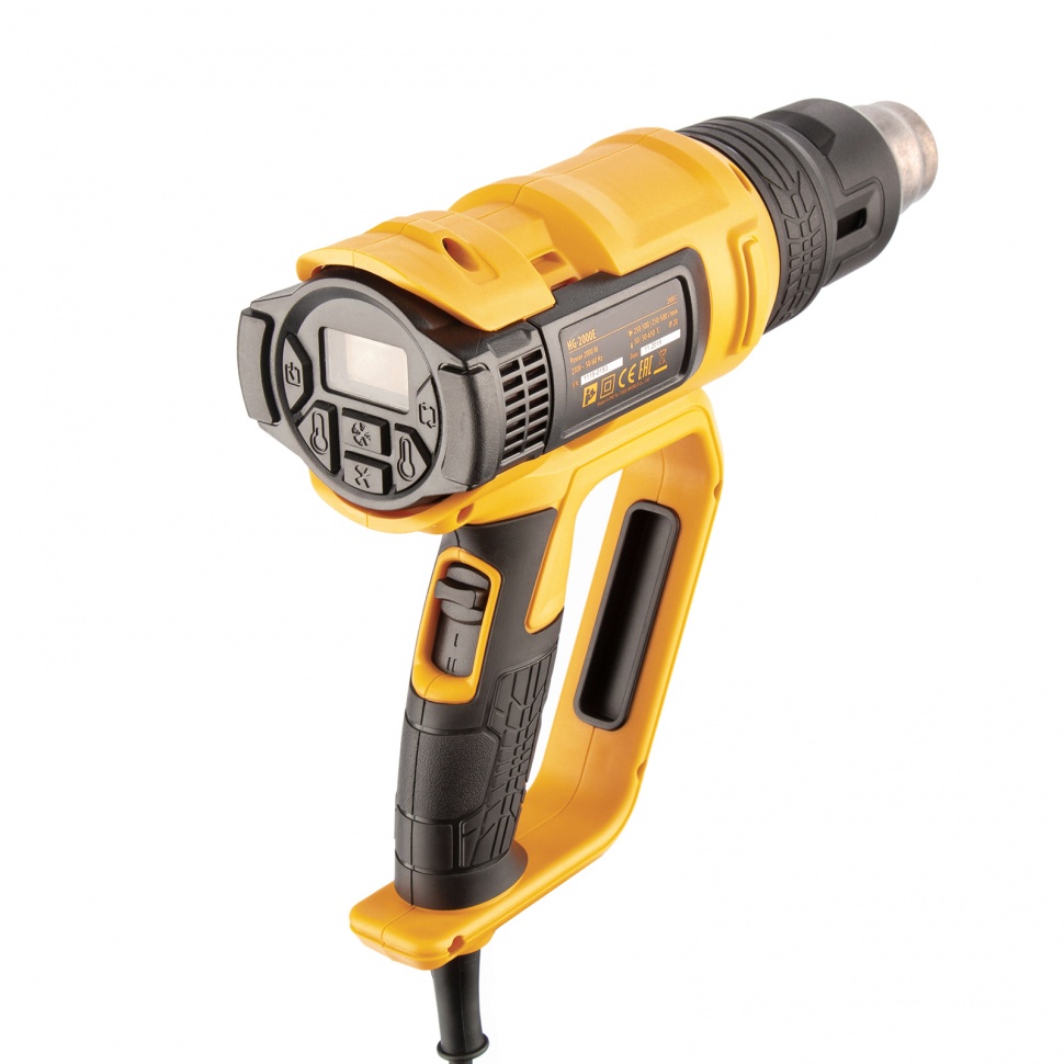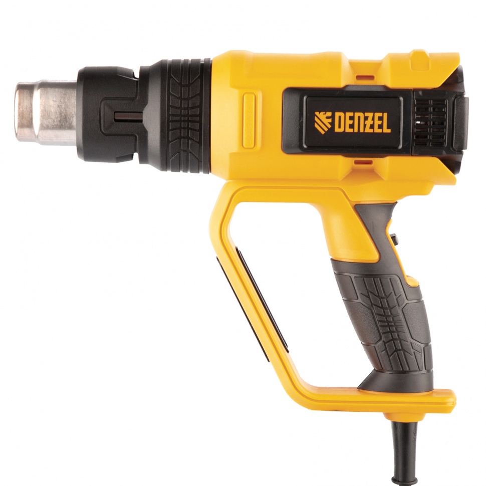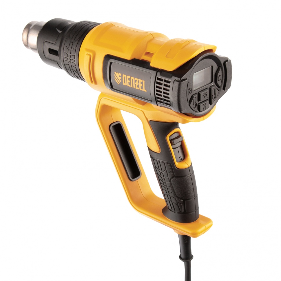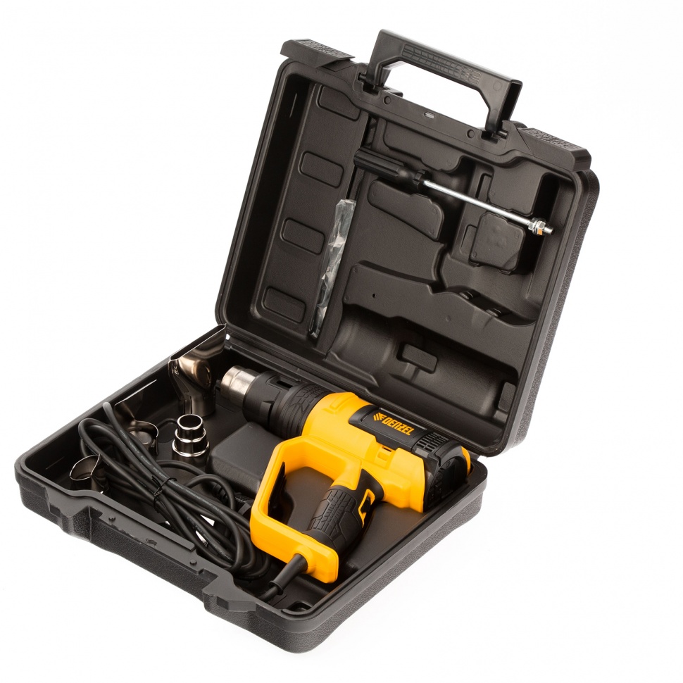 Профессиональный технический фен Denzel HG-2000E 28007 мощностью 2000 Вт, с 2 режимами и LCD дисплеем, предназначен для нагрева и сушки различных соединений и поверхностей. Применяется при снятии лакокрасочных покрытий, удалении старого линолеума и плитки, пайке металла и сварке пластика, разморозке труб, а также в процессе других задач в быту и на строительных объектах.Высокая мощность двигателя 2 кВт обеспечивает производительность 250-500 л/мин. Максимальная рабочая температура составляет 650 ?. Надежный и долговечный нагревательный элемент с керамическим каркасом устойчив к продолжительной эксплуатации. ПреимуществаДва режима работы — нагрев и продувка с температурой 50-650 и 50 ? соответственно (продувка снижает риск перегрева и теплового удара после отключения питания).Легкий контроль рабочих параметров — фен оснащен LCD дисплеем.Функция памяти — можно сохранить до 4-х настроек температуры и производительности, чтобы быстро перейти к ранее использованному режиму.Поддержание необходимой температуры — фен оснащен датчиком обратной связи между блоком управления и нагревательным элементом.Удобная настройка — независимая ступенчатая регулировка температуры и производительности расширяет спектр задач, с которыми может справиться фен.Защита от перегрева и перегрузки — фен автоматически отключается при возникновении нештатных ситуаций (замыкании спирали, остановке вентилятора, перекрытии выходного отверстия), что исключает его поломку.Полная готовность к работе — к устройству прилагается комплект дополнительных насадок.Эргономичная и сбалансированная конструкция — фен можно установить на плоской поверхности соплом вверх, избежав отключения при перерыве в работе.Комфорт и безопасность — прорезиненная рукоятка D-образной формы хорошо ложится в руку и исключает случайное соприкосновение с разогретой поверхностью.Кабель питания длиной 3 м с резиновой изоляцией — можно расширить рабочую зону без помощи удлинителя, работать при температуре от 0 ? и без риска поломки подвергать фен кратковременному воздействию высоких температур.Удобное хранение и транспортировка — инструмент поставляется в пластиковом боксе.Гарантия 3 года — высокое качество фена подтверждено производителем.