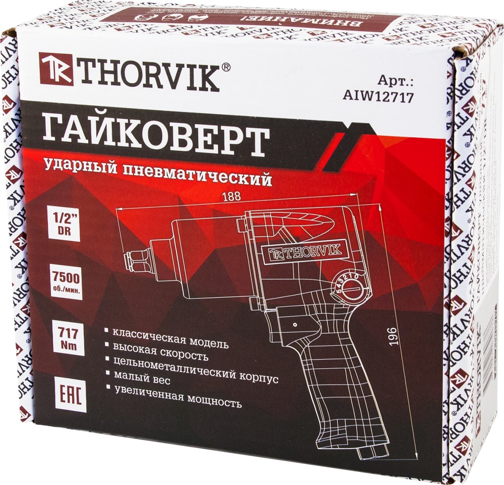 Гайковерт ударный пневматический, 1/2"DR 7500 об/мин, 717 Нм. Имеет цельнометалический корпус, высокую мощность в совокупности с малым весом и низким уровнем вибрации, что позволяет комфортно работать в любых условиях. Пневмомеханические гайковерты TORVIK применяются для проведения слесарномонтажных работ и работ, связанных с обслуживанием резьбовых соединений в мастерских, цехах и производственных помещениях, имеющих источник сжатого воздуха или компрессор, необходимой мощности и производительности с давлением не ниже 6 кг/смкв.., в температурном диапазоне от -20град.С до +50град.С, персоналом, имеющим соответствующую квалификацию, знакомым с правилами техники безопасности, условиями эксплуатации и навыками работы с пневмомеханическим инструментом. Инструкция по эксплуатации Перед началом работы необходимо прикрутить штуцер для последующего присоединения к пневмомагистрали и произвести смазку изделия, для этого нанесите 4-5 капель во внутрь изделия через штуцер подачи воздуха. Продуйте соединительный шланг сильным напором воздуха для удаления конденсата, подсоедините инструмент к воздушному шлангу, установите нужное давление в магистрали на входе (не более 6,3 атм. (кгс/смкв.) при включенном инструменте), при работе с шлангом, длинной более 8 м., давление в магистрали можно увеличить.