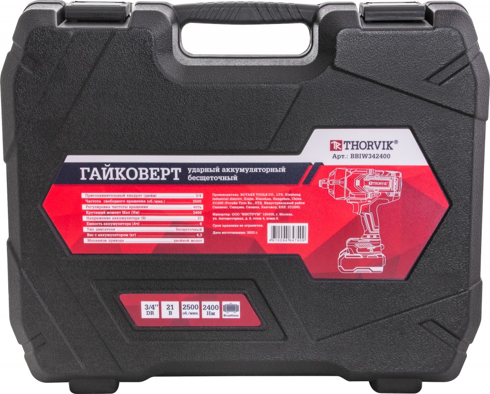 Гайковерт ударный аккумуляторный бесщёточный 3/4"DR, 21В, 2400 Нм. Ударопрочная рукоятка с полимерными бензомаслостойкими вставками. Блок управления скоростями и автостопом со световой индикацией. Аккумуляторная батарея с индикацией заряда. Аккумуляторные гайковерты Thorvik применяются для проведения слесарно-монтажных работ и работ, связанных с обслуживанием резьбовых соединений в мастерских, цехах и производственных помещениях, персоналом, имеющему соответствующую квалификацию и навыки работы с электроинструментом, знакомым с правилами техники безопасности, условиями эксплуатации.