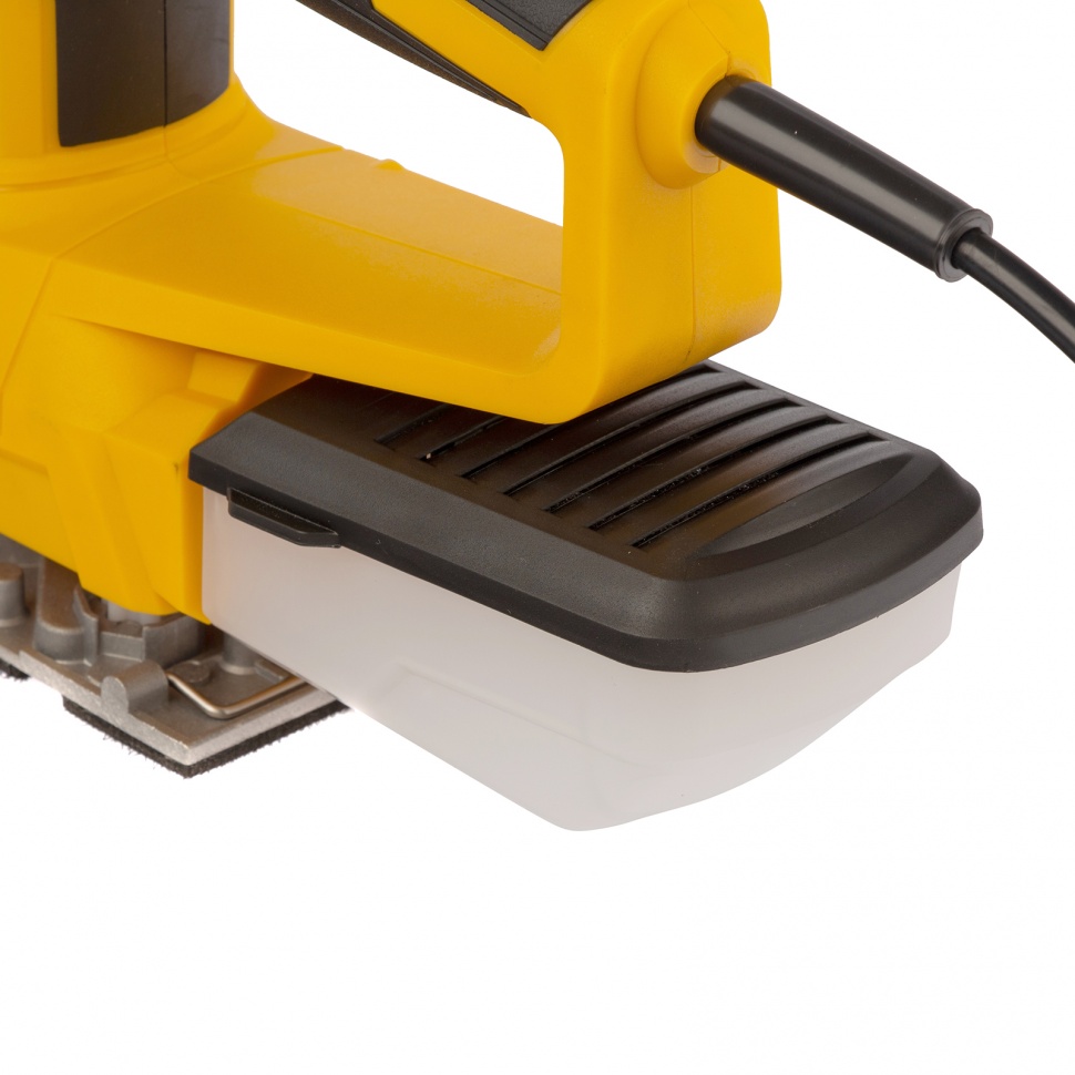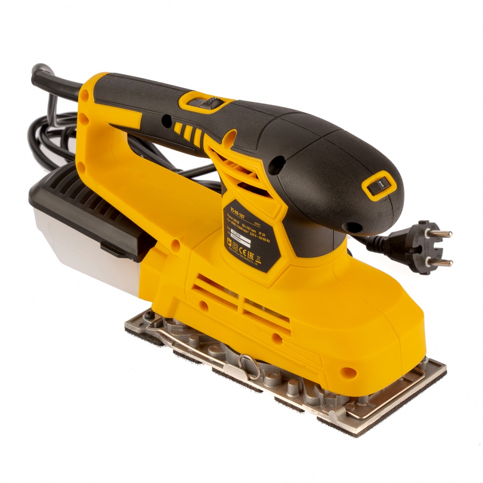 Вибрационная плоскошлифовальная машина Denzel VS-90-187 мощностью 240 Вт, с частотой колебаний подошвы 6000-11000 об/мин, подходит для сухого шлифования, зачистки и полировки поверхностей. Регулировка частоты колебаний подошвы 6000-11000 об/мин позволяет выбрать оптимальный режим работы. Размер рабочей поверхности составляет 90 х 187 мм, ход платформы — 1,6 мм, благодаря чему машина эффективно справляется с обработкой больших поверхностей.ПреимуществаЭффективность — металлическая рабочая подошва обеспечивает высокую производительность, а благодаря прямоугольной форме позволяет производить обработку в углах.Чистота на рабочем месте — конструкцией предусмотрена встроенная система сбора пыли.Универсальное крепление — можно использовать как абразивный материал на липучках (VELCRO), так и обычную шлифовальную бумагу.Простой уход — пластиковый контейнер для мусора легко снимается и разбирается.Электробезопасность — токопроводящие элементы имеют двойную изоляцию, инструменту присвоен класс защиты II.Сетевой кабель 3 м — можно свободно перемещаться по рабочей зоне.Полная готовность к работе — в комплект входит пластина для прокалывания шлифбумаги, запасные угольные щетки и шлифовальное полотно.Комфортная работа — благодаря фиксатору кнопку включения не нужно постоянно удерживать, рукоятка с эластичными накладками не скользит в руке.Гарантия 3 года — надежность шлифмашины подтверждена производителем.