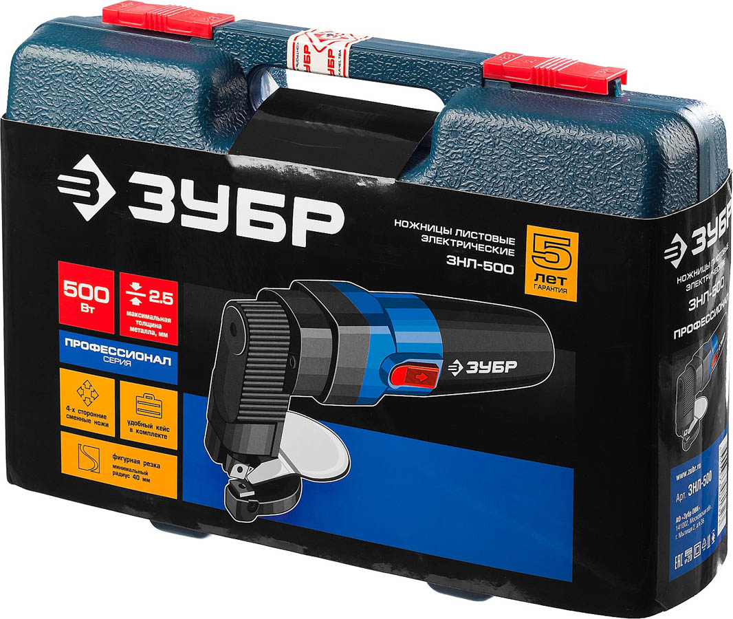 Ножницы по металлу электрические ЗУБР ЗНЛ-500, предназначены для резки листового металла. Возможность резать листовой металл толщиной до 2,5 мм. Позволяет производить фигурную резку с радиусом до 40 мм. Удобный хват для большего комфорта и лучшего качества работы. Отличный обзор линии реза. Высокая скорость резки благодаря мощному двигателю и специальному механизму. Защитный козырек защищает руки и предотвращает травмы от стружки. Ножи с 4-мя режущими гранями. Быстрая система смены ножей для большей производительности. Набор щупов в комплекте для настройки механизма под толщину разрезаемого металла. Удобный пластиковый кейс для хранения и переноски.