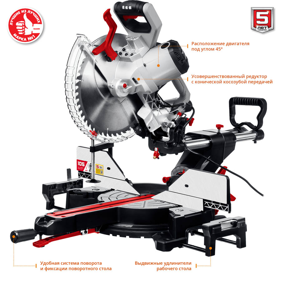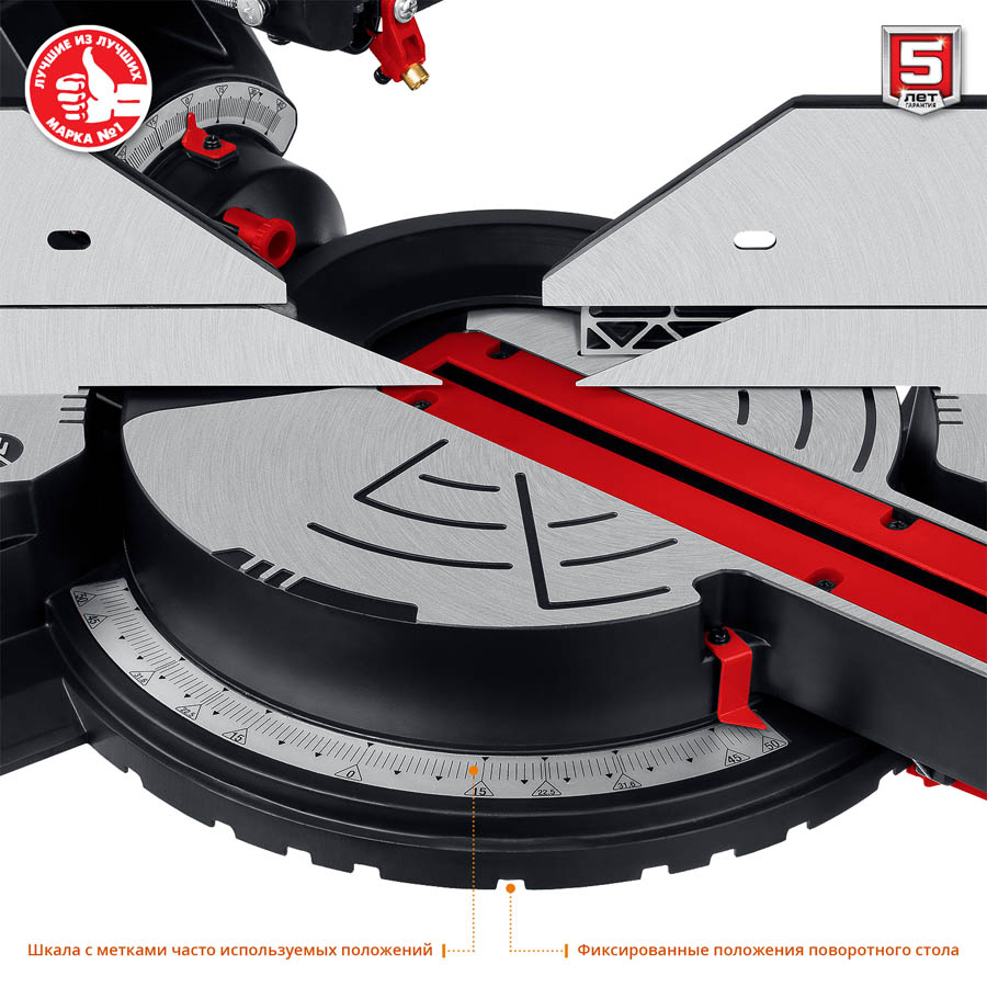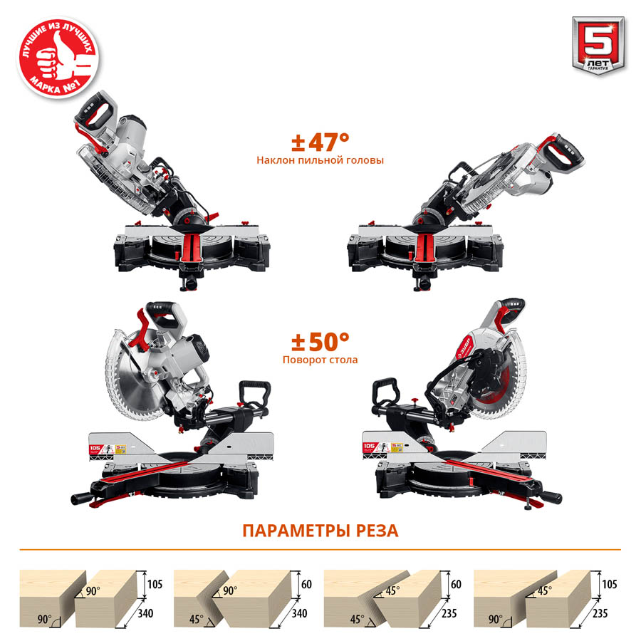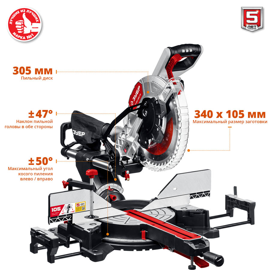 Пила торцовочная ЗУБР ЗПТ-305-1800 ПЛ, предназначена для быстрого и точного распиливания древесины и синтетических материалов. Подвижная пильная голова с возможностью наклона в обе стороны на 45° позволяет распиливать заготовки шириной до 340 мм. Увеличенный диаметр диска и множество настроек пиления. Высокая точность реза благодаря выверенной конструкции. Увеличенная ширина пиления благодаря сдвижной голове диска и легкое скольжение на подшипниках. Фирменный диск с большим количеством зубьев для чистого качественного пиления. Лазерный указатель места реза облегчает работу. Бесступенчатый поворот стола с фиксированными положениями и удобная регулировка наклона. Струбцина в комплекте надежно фиксирует обрабатываемую заготовку. Удлинительные опоры стола предотвращают опрокидывание отпиленной заготовки. Мешок для сбора опилок и возможность подключения пылесоса способствуют более чистой работе. Защитные блокировки (включения и доступа к диску) для безопасности оператора.