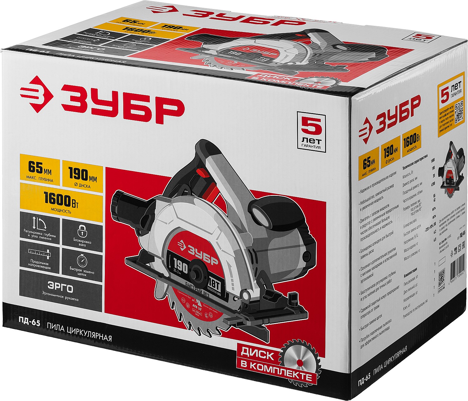 Пила дисковая ЗУБР ПД-65, предназначена для распиловочных работ по дереву и иным материалам (при установке соответствующего диска) под различными углами, а также под наклоном. Имеет небольшой вес, очень компактный с увеличенной мощностью. Двигатель с запасом мощности и редуктор с увеличенным передаточным числом обеспечивают большую производительность и надежность. Диск с твердосплавными напайками и оптимальным количеством зубьев для производительного пиления. Основная и дополнительная рукоятки с мягкими накладками и естественной эргономикой. Усовершенствованная конструкция и точность пиления, современный дизайн и удобство в работе, улучшенные параметры и безопасность оператора являются основой качественного и легкого пиления.
