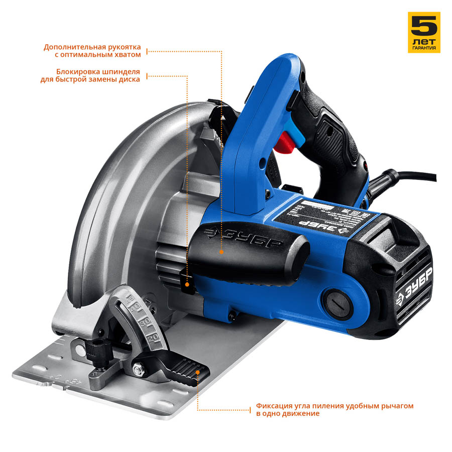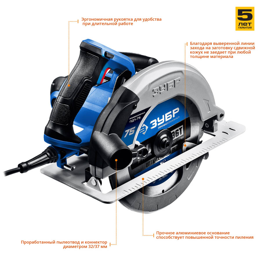 Циркулярная пила ЗУБР ПДП-75, предназначена для выполнения распиловочных работ по дереву и иным материалам (при установке соответствующего диска) под различными углами, а также под наклоном. Максимальные мощность и диаметр диска обеспечивают легкое пиление древесины любой породы на любую доступную глубину. Плавный пуск предотвращает рывок инструмента при включении, что увеличивает безопасность. Патрубок для подключения пылесоса для эффективного пылеотвода. Легко скользящий защитный кожух предохраняет оператора от травм. Дополнительная рукоятка обеспечивает удобство и полный контроль во время работы. Удобный встроеный держатель ключа позволяет не потерять его при работе и хранении. Быстрый доступ к щеткам для простой замены. Малые вес и габариты повышают удобство пользования, маневренность и производительность.