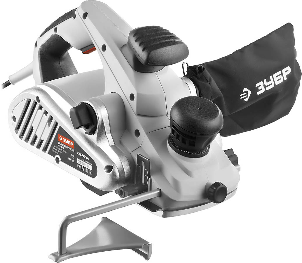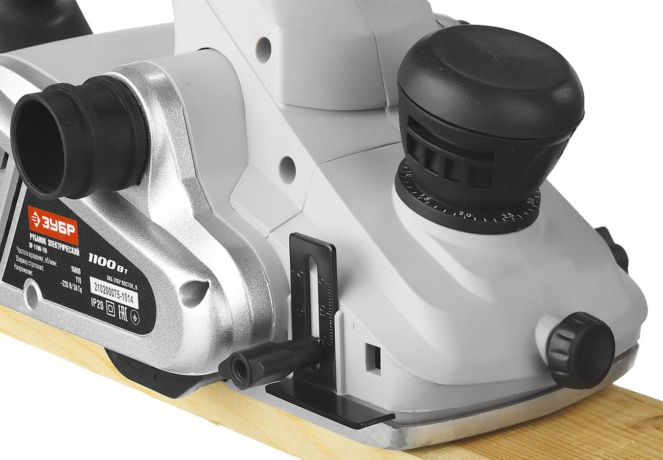 Рубанок электрический ЗУБР ЗР-1100-110, предназначен для строгания и выравнивания поверхностей, выборки четвертей и снятия фасок. Инструмент большой мощности способен справиться с древесиной любой твердости. Мощный электродвигатель, позволяющий строгать без рывков и перегрева. Электронная система плавного пуска, поддержания оборотов под нагрузкой и защиты от перегрузки. Точная плавная регулировка глубины строгания с шагом 0,1 мм. Отдельная дополнительная рукоятка, не совмещенная с настройкой глубины, позволяет не сбивать выставленное значение при работе. Настраиваемый выброс опилок влево или вправо. Два ножа из быстрорежущей стали, установленные под углом к обрабатываемой поверхности. Литые подошвы гарантируют точность геометрии весь срок службы, а благодаря фрезеровке рубанок легко скользит по заготовке. Блокировка выключателя предотвращает случайное включение инструмента. Возможность подключения к пылесосу.