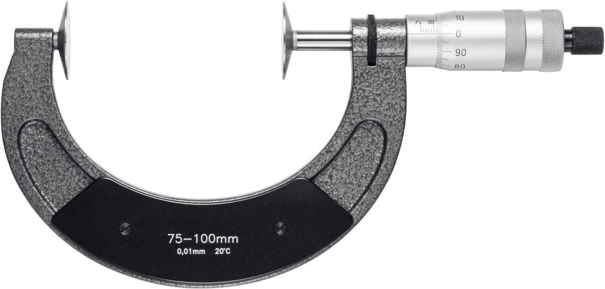 <div>Измерительные диски из закалённой стали в плоском исполнении <b>без углубления</b>. Микрометрический винт закалённый и шлифованный. Точность выше, чем по <b>DIN 863</b>. Фиксация зажимным устройством. С фрикционной трещоткой и теплоизолирующей накладкой. С чётко выгравированными чёрными делениями и цифрами.</div>