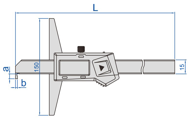 Цифровой глубиномер с крюком. С интерфейсом данных. С измерительной поверхностью рамки в виде плоской прямоугольной поверхности основания и измерительной поверхностью штанги в виде поперечного выступа.