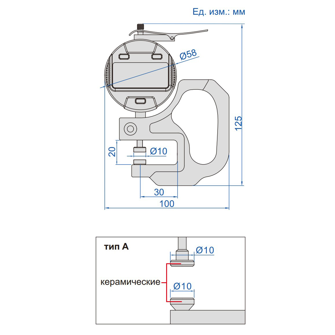 Цифровой толщиномер. Толщиномер состоит из корпуса, неподвижного плоского измерительного наконечника, подвижного плоского измерительного стержня, отсчетного устройства и арретира для толщиномеров с нормированным измерительным усилием.