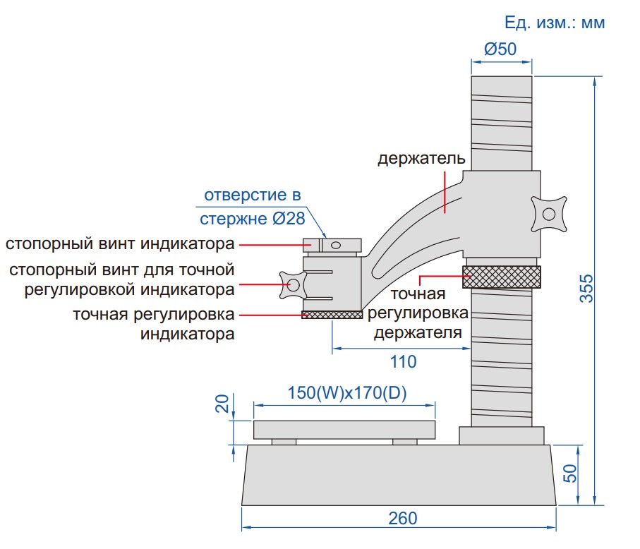 • Дополнительная принадлежность: втулка Ø28 мм/Ø8 мм, цифровые/циферблатные индикаторы 0.001 мм, высокоточные цифровые индикаторы, манометр