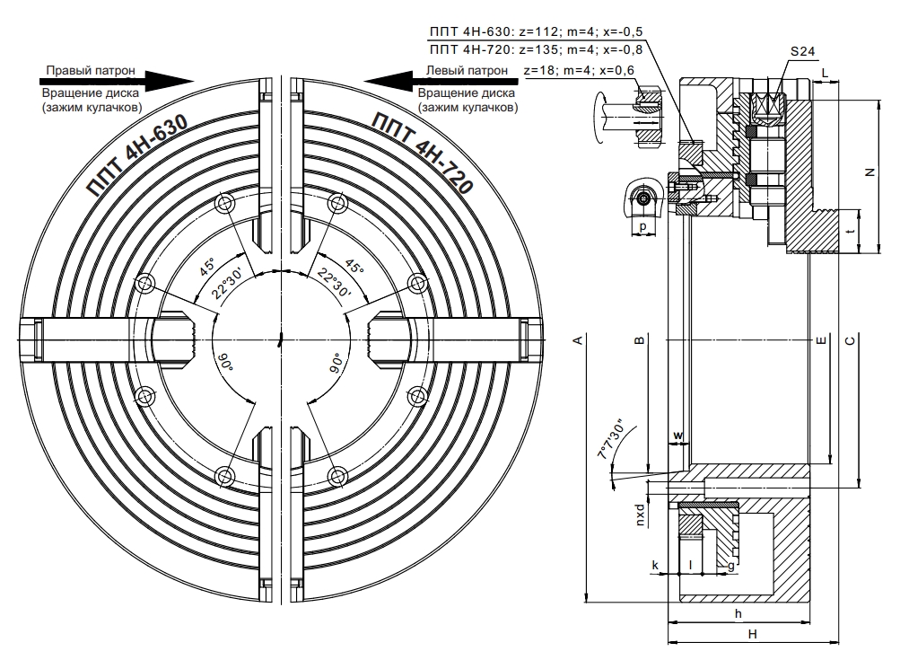 Патрон токарный 4-х кулачковый комбинированный для обработки труб ППT4H-720.320M левый БЗСП