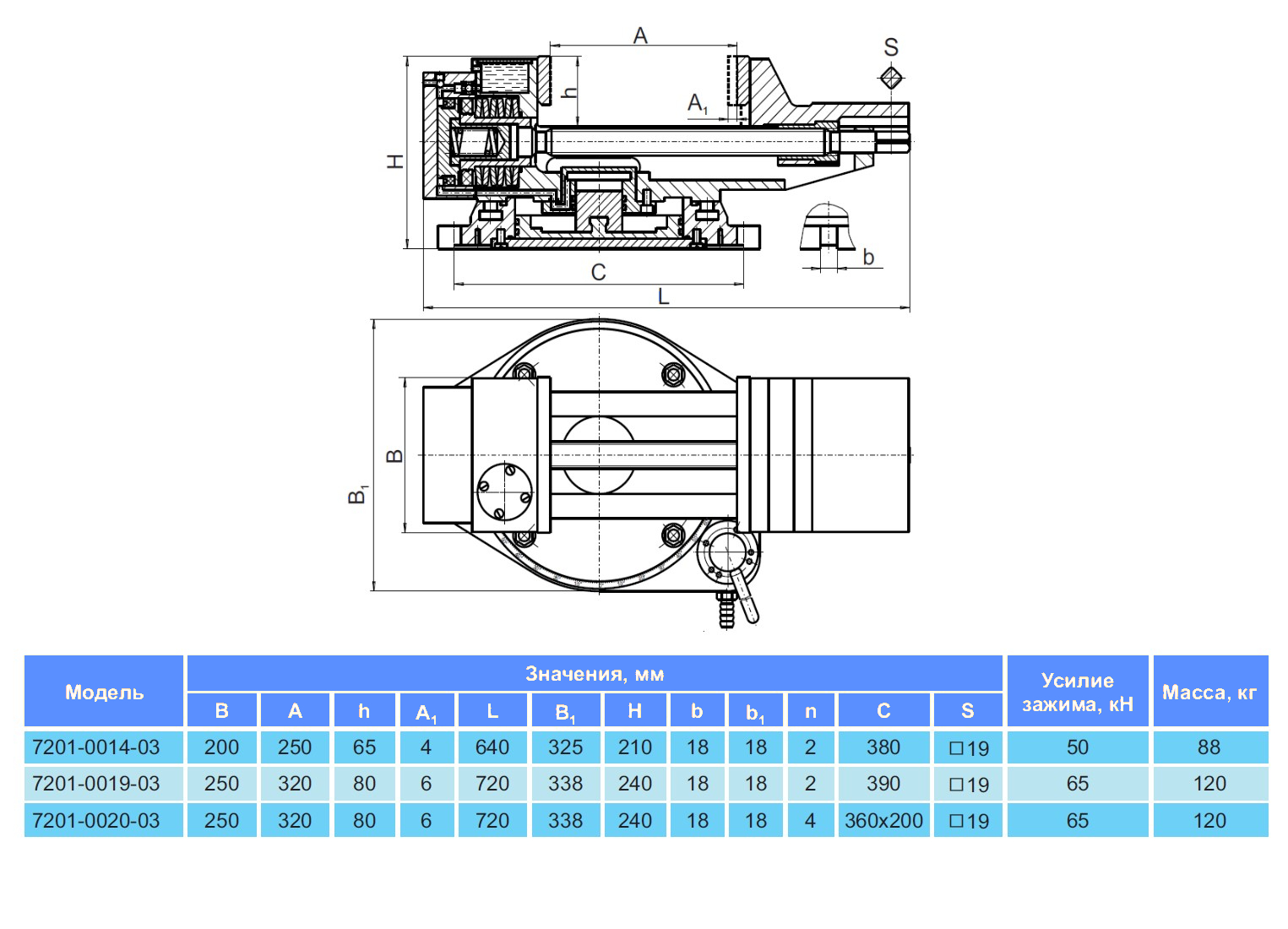 Тиски станочные пневматические с гидравлическим усилением предназначены для закрепления деталей при механической обработке металлов резанием на фрезерных, строгальных, сверлильных и других станках. Класс точности тисков Н и П по ГОСТ 16518 (DIN 6370). Корпусные детали тисков изготавливаются из чугуна. Установка тисков на столе станка осуществляется с помощью шпонок, крепление с помощью n пазов b . 1 Зажим заготовки производится посредством пакета тарельчатых пружин, которые предварительно сжаты силовым механизмом. Силовой механизм представляет собой встроенный пневмогидроусилитель. Зажим заготовки тарельчатыми пружинами обеспечивает безопасность закрепления деталей при полном падении давления воздуха в сети. Номинальное давление воздуха 0,6 МПа.