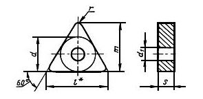 Пластины режущие сменные многогранные твердосплавные трехгранной формы с отверстием. Сменные многогранные твердосплавные пластины (СМТП) трехгранной формы используют для оснастки токарных проходных, подрезных и расточных резцов. Метод крепления твердосплавных пластин отличается в зависимости вида пластины. СМТП трехгранной формы без отверстия крепятся методом прихвата, т.е. режущие пластины устанавливают в закрытое гнездо державки по двум базовым поверхностям и прихватом прижимают сверху к опорной поверхности. При помощи дифференциального винта осуществляется быстрый съем пластины. Рычажный метод используется для закрепления твердосплавных пластин с цилиндрическим отверстием (механическое крепление режущих пластин). Использование твердосплавных сменных пластин является существенным способом экономии денежных средств предприятиями металлообрабатывающей промышленности, так как инструмент, изготовленный из менее прочных и потому более дешевых сталей, со сменными твердосплавными пластинами, существенно дешевле монолитного твердосплавного. Существенным преимуществом использования СМТП является увеличение срока службы державки резца. Изготавливаются пластины по ГОСТу 19044-80 из твердых сталей марок B35 (современный аналог сплава ВК8), H30 (современный аналог сплава Т5К10) и H10 (современный аналог сплава Т15К6) и обозначаются TNUA, TNMA.