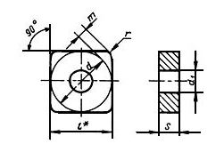 Пластины режущие сменные многогранные твердосплавные квадратной формы с отверстием. Сменные многогранные твердосплавные пластины (СМТП) квадратной формы используют для оснастки токарных проходных, расточных резцов и торцовых фрез. Метод крепления твердосплавных пластин отличается в зависимости вида пластины. СМТП квадратной формы без отверстия крепятся методом прихвата, т.е. режущие пластины устанавливают в закрытое гнездо державки по двум базовым поверхностям и прихватом прижимают сверху к опорной поверхности. При помощи дифференциального винта осуществляется быстрый съем пластины. Рычажный метод используется для закрепления твердосплавных пластин с цилиндрическим отверстием (механическое крепление режущих пластин). Использование твердосплавных сменных пластин является существенным способом экономии денежных средств предприятиями металлообрабатывающей промышленности, так как инструмент, изготовленный из менее прочных и потому более дешевых сталей, со сменными твердосплавными пластинами, существенно дешевле монолитного твердосплавного. Существенным преимуществом использования СМТП является увеличение срока службы державки резца. Изготавливаются пластины по ГОСТу 19051-80 из твердых сталей марок B35 (современный аналог сплава ВК8), H30 (современный аналог сплава Т5К10) и H10 (современный аналог сплава Т15К6) и обозначаются SNUA, SNMA.