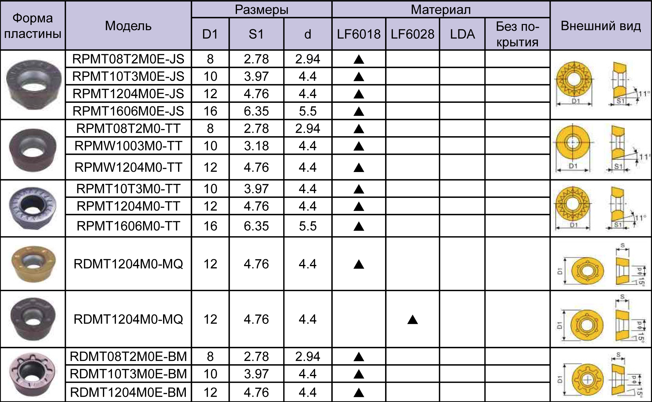 RPMT 1003MO-TT LF6018 фрезерная пластина Deskar - сменная твердосплавная пластина RPMT по металлу предназначена для обработки материалов по ISO: PMS.