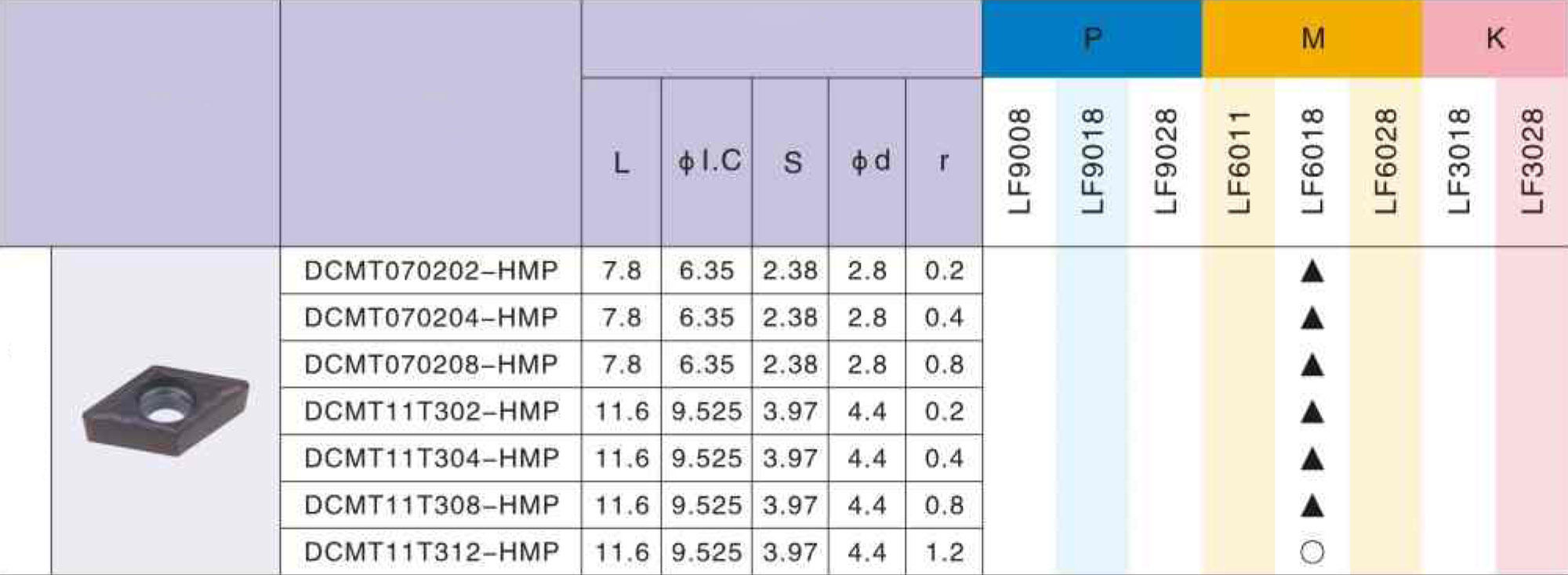 DCMT11T308 LF6118 токарная пластина Deskar - сменная твердосплавная пластина DCMT по металлу предназначена для обработки материалов по ISO: PMK.