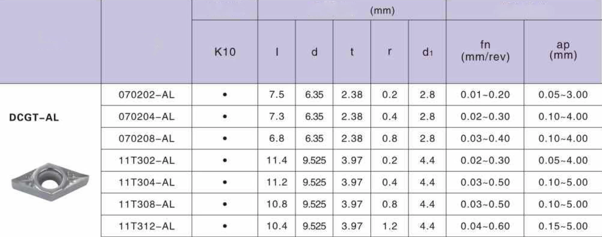 DCGT11T308 AL K10 токарная пластина Deskar - сменная твердосплавная пластина DCGT по металлу предназначена для обработки материалов по ISO: N.