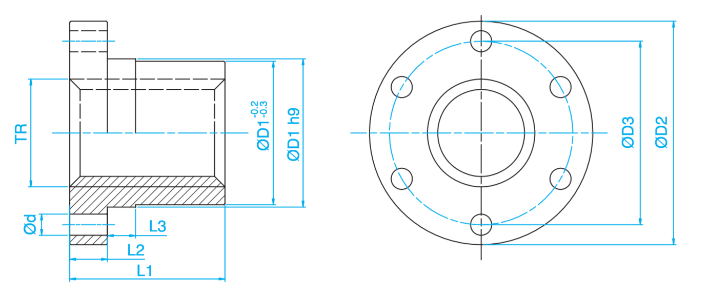 Доставка инструмента Гайка трап. с фланцем (бронза) d=20 мм, шаг 4 мм (прав. резьба), BFM 20-4-D TECHNIX