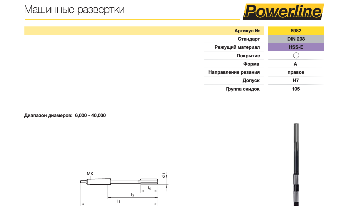 Развертка машинная цельная с коническим хвостовиком (к/х) изготовляется из быстрорежущей стали марки «Р6М5» по ГОСТу 1672-80. Собственно назначением конического хвостовика является закрепление самой развертки на станке, поэтому данный вид разверток используют для машинного развертывания на координатно-расточных, револьверных, сверлильных, токарных и других видах станков. Развертки машинные к/х производятся диаметром от 5,5 до 50мм, с полями допусков G6, Н6, Js6, К6, G7, Н7, Js7, К7, М7, N7, Р7, Е8, U8, F8, Н8, D9, Е9, F9, Н9, Н10, Н11 и припуском под доводку — N 1, 2, 3, 4, 5, 6.