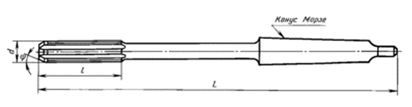 Развертка машинная цельная с коническим хвостовиком (к/х) изготовляется из быстрорежущей стали марки «Р6М5» по ГОСТу 1672-80. Собственно назначением конического хвостовика является закрепление самой развертки на станке, поэтому данный вид разверток используют для машинного развертывания на координатно-расточных, револьверных, сверлильных, токарных и других видах станков. Развертки машинные к/х производятся диаметром от 5,5 до 50мм, с полями допусков G6, Н6, Js6, К6, G7, Н7, Js7, К7, М7, N7, Р7, Е8, U8, F8, Н8, D9, Е9, F9, Н9, Н10, Н11 и припуском под доводку — N 1, 2, 3, 4, 5, 6.