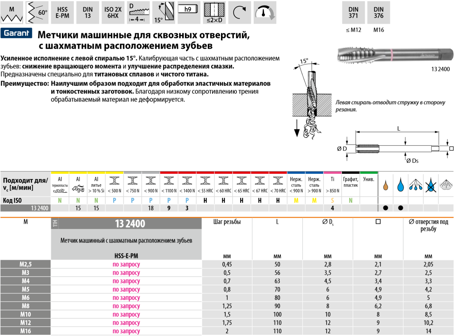 Усиленное исполнение с левой спиралью 15°. Калибрующая часть с шахматным расположением зубьев: снижение вращающего момента и улучшение распределения смазки.