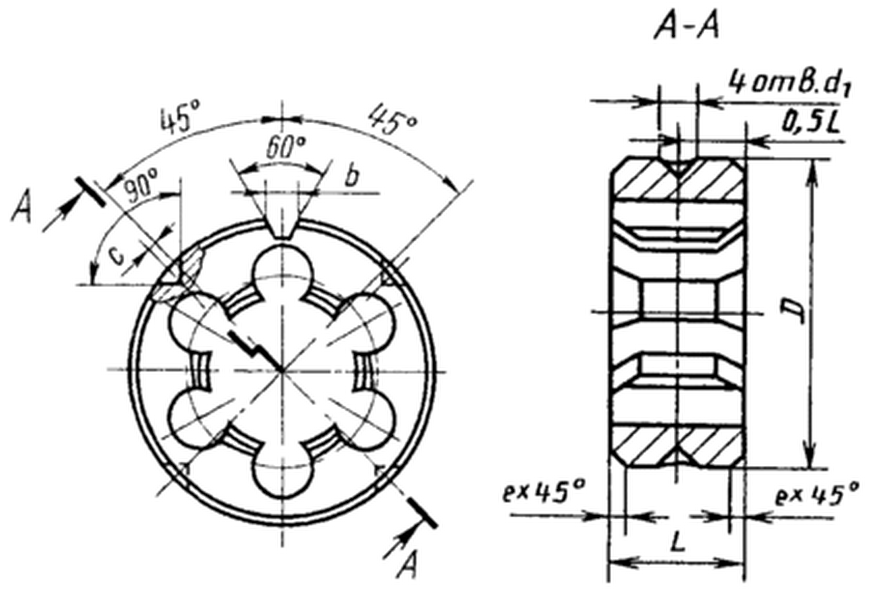 Плашки соответствуют ГОСТ 9740-71 Плашки круглые. Технические условия. Класс точности - А. Инструментом формируется правая резьба - вращение и основная нагрузка направлены по часовой стрелке.