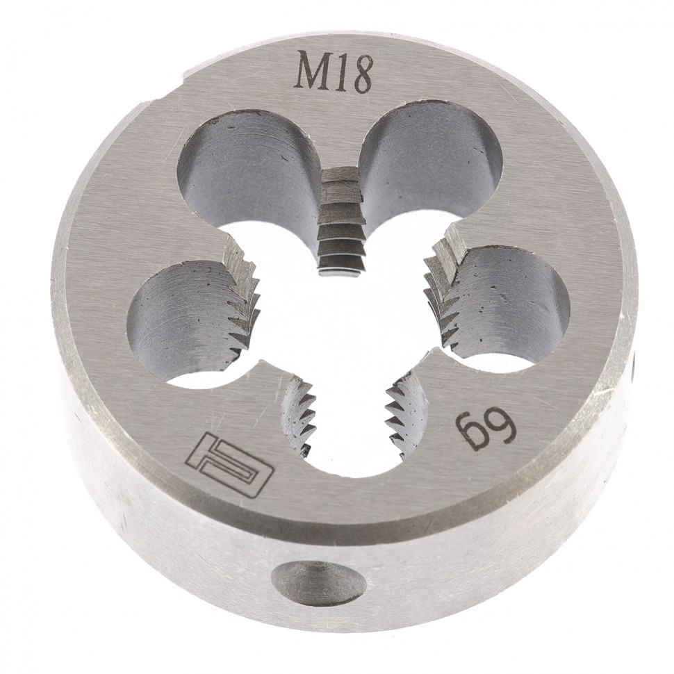 Плашка М 18х2,5 Сибртех — инструмент для ручного или машинного нарезания наружной резьбы на металлических деталях цилиндрической формы. Изделие выполнено из стали 9ХС - инструментальной стали, легированной хромом и кремнием. Сталь отличается повышенной усталостной прочностью при кручении, изгибе и контактном нагружении. Твердость материала составляет 241 МПа.