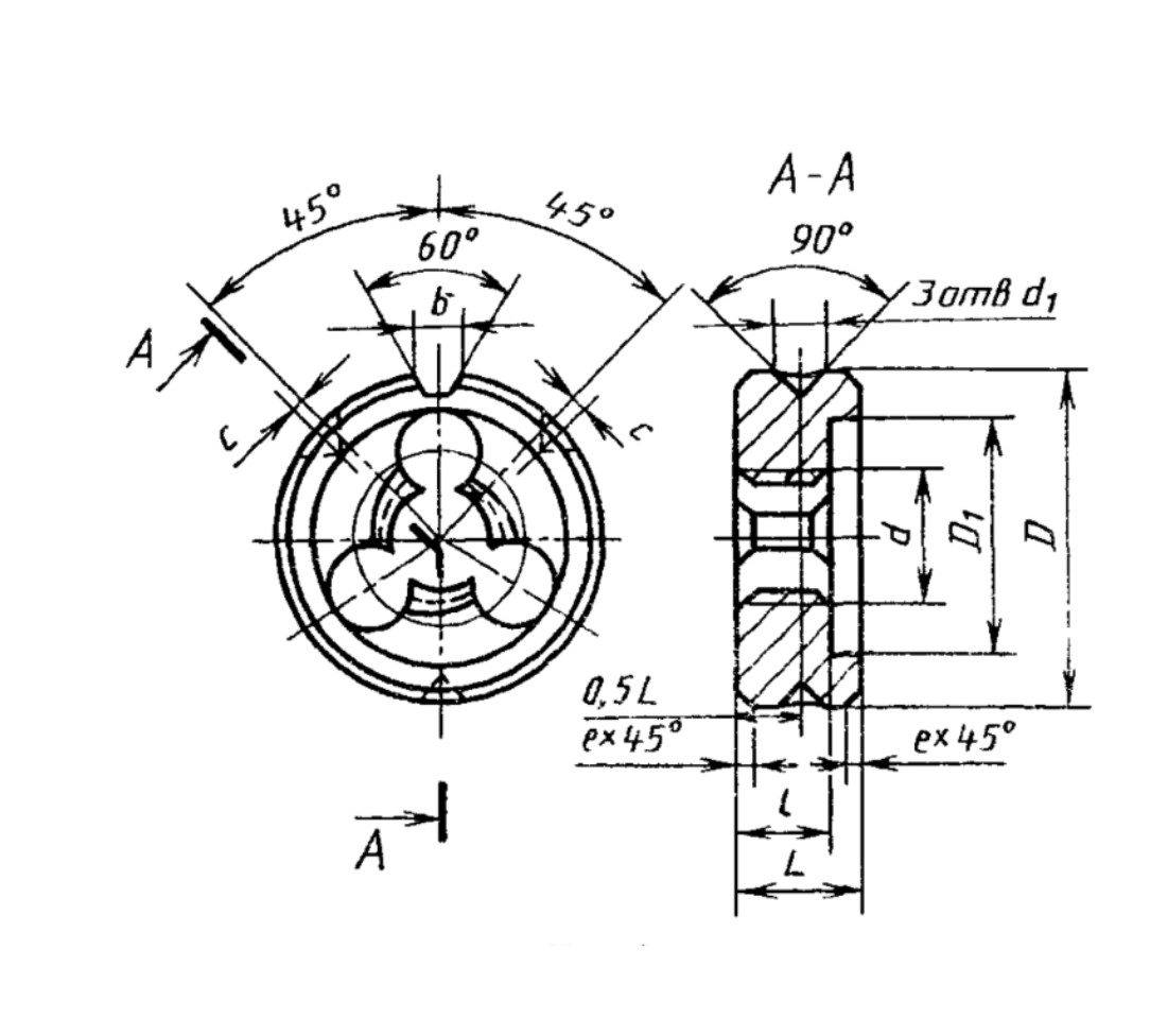 Плашки соответствуют ГОСТ 9740-71 Плашки круглые. Технические условия. Класс точности - 6g (Средний класс точности). Инструментом формируется правая резьба - вращение и основная нагрузка направлены по часовой стрелке.