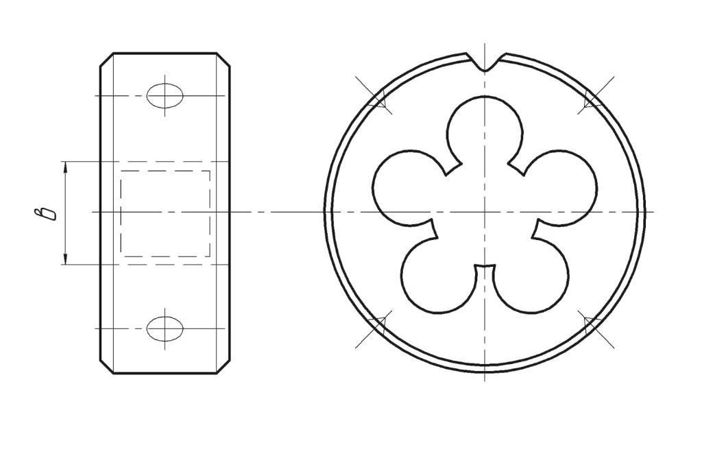 Плашки соответствуют DIN 223 Плашки круглые (лерки) для метрической резьбы. Класс точности - 2А. Инструментом формируется правая резьба - вращение и основная нагрузка направлены по часовой стрелке.
