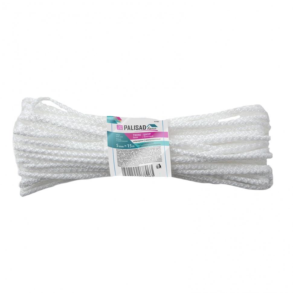Белый полипропиленовый бельевой шнур Palisad Home 937085 с сердечником, диаметром 5 мм и длиной 15 м, используется для сушки белья, а также в качестве хозяйственной веревки в быту, на рыбалке или в походе. От обычной бельевой веревки для сушки он отличается сердечником из полипропилена, увеличивающим стойкость к нагрузкам. Шнур с полипропиленовой оплеткой выдерживает разрывную нагрузку до 70 кгс, устойчив к растяжению и не провисает под весом мокрых вещей.ПреимуществаШнур изготовлен из полипропилена, не гниет и не разрушается под действием агрессивных сред, что увеличивает срок его службы.Изделие устойчиво к износу, выдерживает многократное изгибание, поэтому рассчитано на длительное использование.Веревка для белья из полипропилена с сердечником устойчива к температурным перепадам, поэтому ее можно использовать как в помещении, так и под открытым небом.Благодаря мягкости и эластичности бельевой трос легко завязывать узлом.
