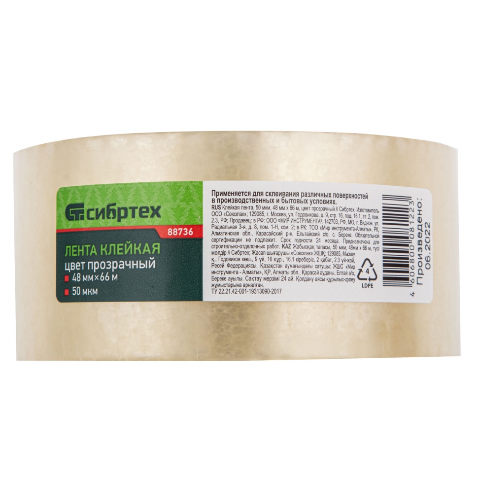 Клейкая лента Сибртех 88736 прозрачного цвета, толщиной 50 мкм, шириной 48 мм и длиной 66 м, используется для прочного скрепления материалов. Она применяется для заклеивания коробок для сохранности содержимого во время транспортировки и хранения. Лента будет полезна в быту, гараже, цеху и т.д.ПреимуществаПрочность и долговечность — лента на основе полипропиленовой пленки устойчива к механическим воздействиям.Толщина 50 мкм — лента характеризуется прочностью на разрыв и морозостойкостью, за счет чего ее можно использовать для упаковки тяжелых грузов на неотапливаемых складах.Прозрачная бесцветная лента — вся информация под лентой останется видимой.Экологичность — лента намотана на картонно-бумажную втулку, которая не вредит окружающей среде при утилизации.Широкая лента 48 мм — подходит для упаковки малогабаритных коробок и склеивания различных материалов.Долгое использование — 66 м ленты в рулоне хватит на большой объем работ.