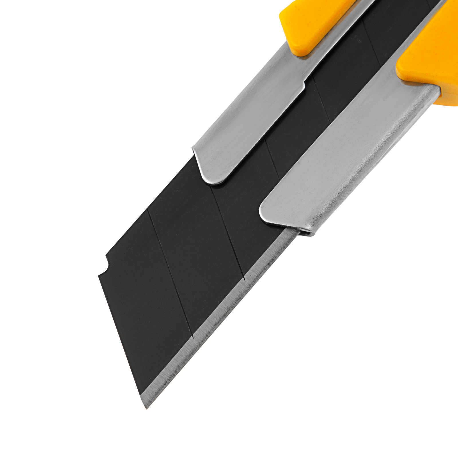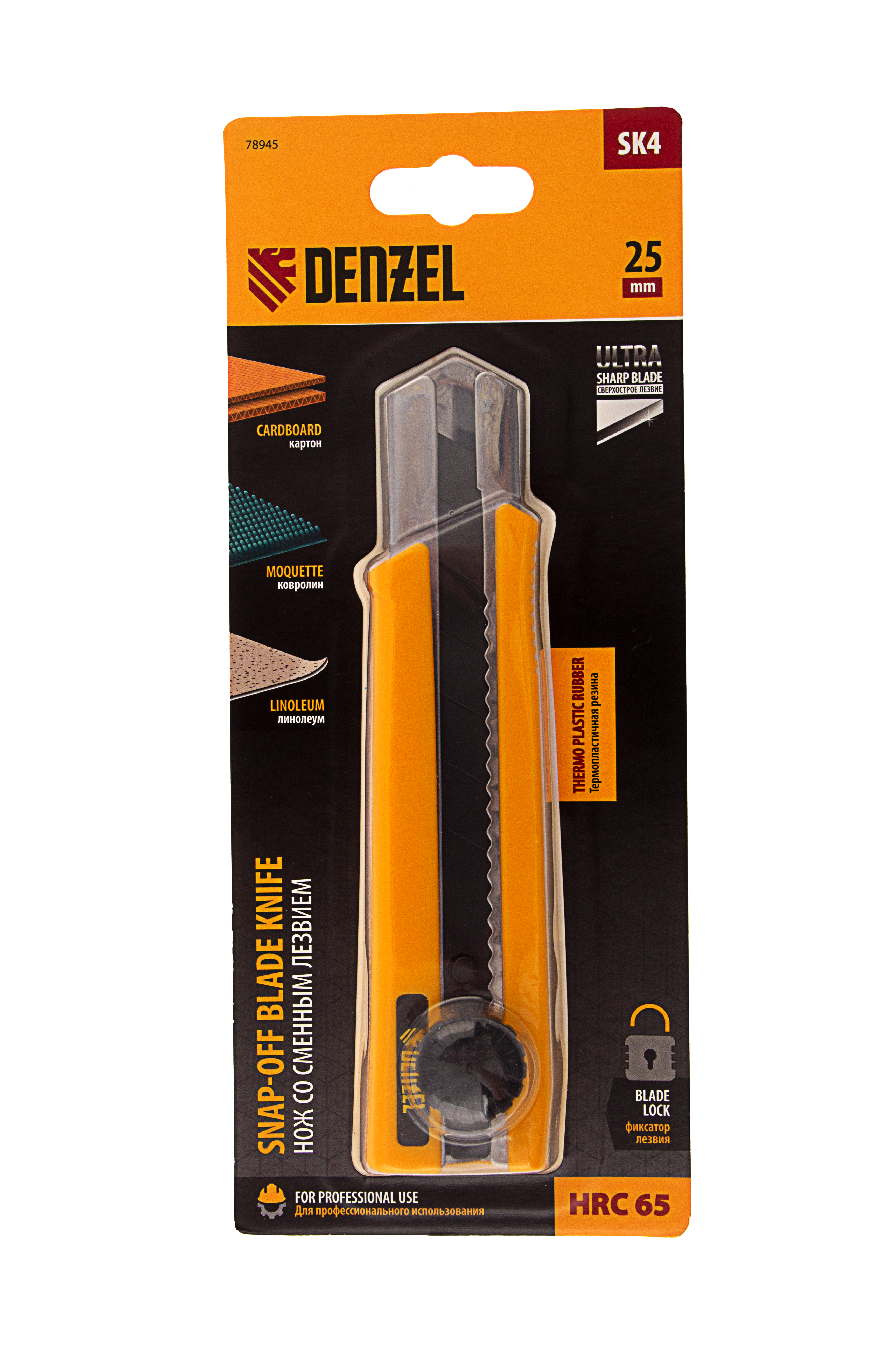 Доставка инструмента Нож, 25 мм, сменное лезвие, SK4, корпус из TPR, метал. направляющая, винтовой фиксатор Denzel