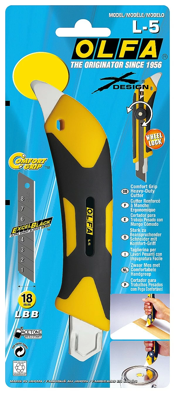 Нож с сегментированным лезвием OLFA OL-L-5, предназначен для резки резины, фанеры, кожи, кровельных и прочих жестких материалов. Поставляется с черным лезвием LBB шириной 18 мм, которое на 25% острее стандартных лезвий OLFA. Винтовой механизм фиксации лезвия с трещоточным колесиком. Направляющие из нержавеющей стали - для надежной фиксации лезвия при выполнении тяжелых работ. Металлический заостренный выступ для выполнения различных работ. Данная модель не подвержена воздействию органических растворителей.