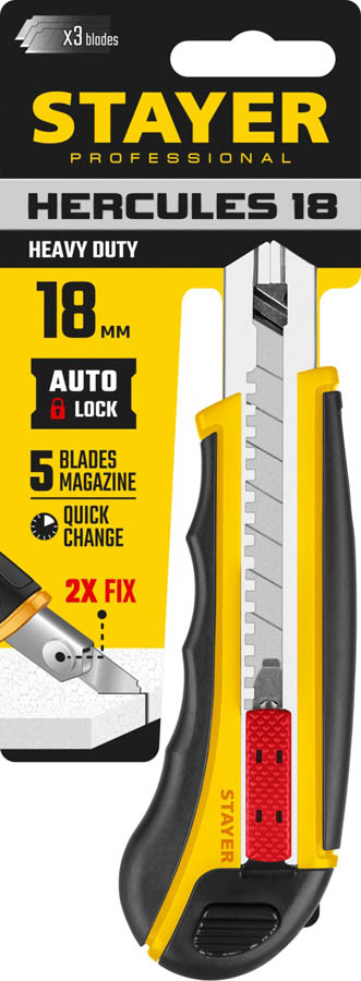 Как купить Нож HERCULES-18STAYER 18 мм, сегментированное лезвие, автостоп, автозамена, дополнительный фиксатор, 09165_z01?
