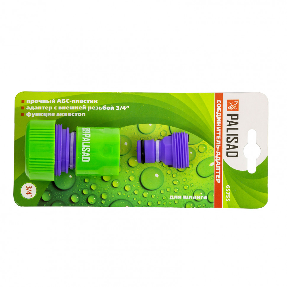 Соединитель быстросъемный с клапаном «автостоп» (для прекращения подачи воды) для шланга 3 4 изготовлен из прочной ABS-пластмассы. В комплект входит адаптер с внешней резьбой 3 4. Набор позволяет подключить шланг диаметром 3 4 со стороны соединителя к крану (водопроводной трубе, разветвителю) с диаметром внутренней резьбы 3 4 со стороны адаптера. Соединительный комплект – адаптер с переходом на штуцер и быстросъемный соединитель с клапаном «автостоп» – изготовлен из ударопрочной ABS-пластмассы. Посадочный диаметр на быстросъемный соединитель для шланга 3 4, на адаптере внешняя резьба диаметром 3 4. Штуцерный выход адаптера совместим со всеми элементами поливочной системы Palisad.