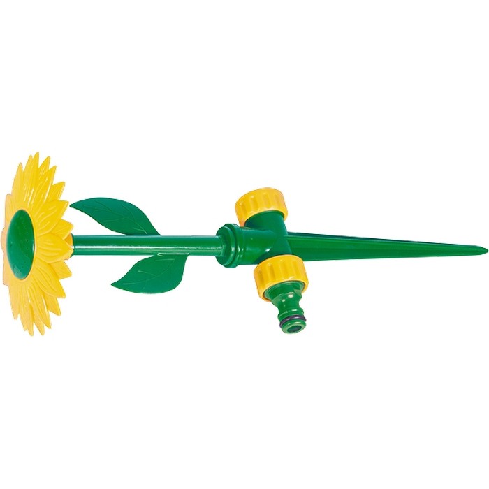 Разбрызгиватель «Подсолнух» со штуцерной посадкой и пикой для закрепления в почве. В центральной части цветка имеется 44 расположенные радиально форсунки. В процессе работы создается эффект душа, что обеспечивает равномерный круговой полив площади до 50 кв. м.
