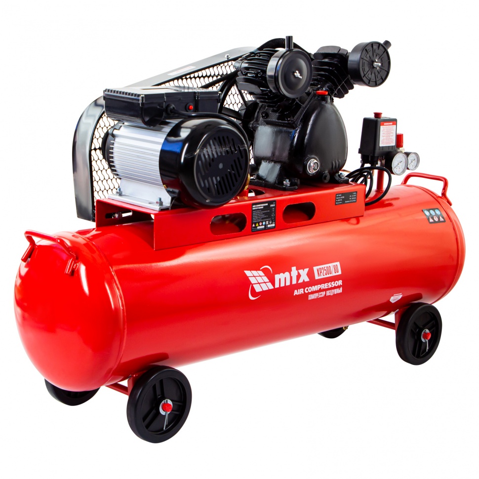Компрессор воздушный МТХ КР2500/80 58047 с ременным приводом от электродвигателя, мощностью 2,5 кВт и производительностью 420 л/мин, с ресивером объемом 80 литров, применяется для подачи сжатого атмосферного воздуха в пневматические инструменты. К нему можно подключать гайковерт, дрель, степлер, краскопульт, продувочный пистолет и т.п.ПреимуществаБезопасность — защита от перегрузки позволяет избежать аварийные ситуации.Защитный клапан — превышение максимально допустимого давления в ресивере исключено.Реле давления — автоматическая регулировка работы с помощью периодических остановок/запуска двигателя позволяет поддерживать стабильную производительность.Повышенный ресурс — чугунный блок цилиндра увеличивает срок эксплуатации компрессора.Увеличенная емкость масляного картера — все детали воздушного компрессора обеспечены достаточной смазкой.Оснащение двумя манометрами — устройства позволяют контролировать давление сжатого воздуха в воздухосборнике и в пневмомагистрали.Простая подготовка к работе — с помощью быстросъемного коннектора пневмооборудование легко подключить.Мобильность — для удобного перемещения компрессор оснащен колесами и ручкой.Низкий уровень шума — значение звуковой мощности не превышает 95 дБ.Готовность к работе — комплект крепежа, колеса, сапун и компрессорное минеральное масло марки DAA100 (500 мл) входят в комплект поставки.