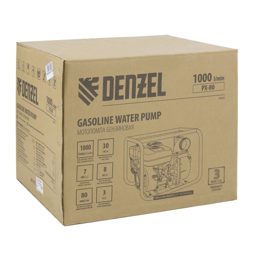 Доставка инструмента Мотопомпа бензиновая для чистой воды PX-80, 7 л.с, 3", 1000 л/мин, глубина 8 м, напор 30 м Denzel